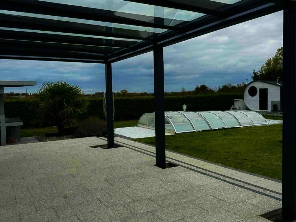 In der nächsten Phase der Umsetzung wird die Überdachung ergänzt durch Rahmen, verschiebbare Glaswände, die Dichtheit, Schutz vor Witterungseinflüssen und vollen Komfort während des größten Teils des Jahres gewährleisten.