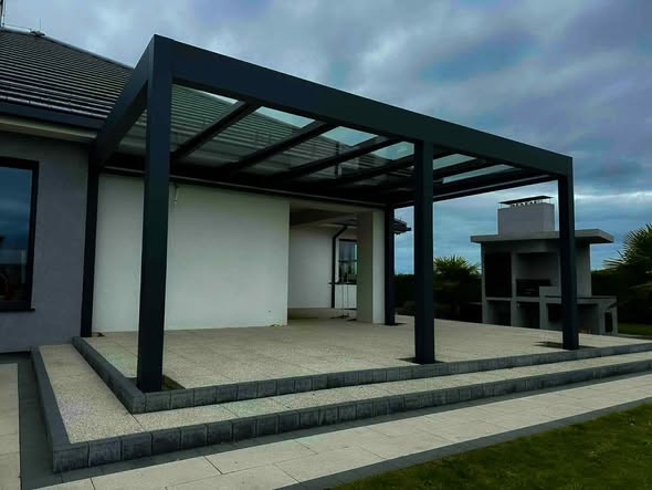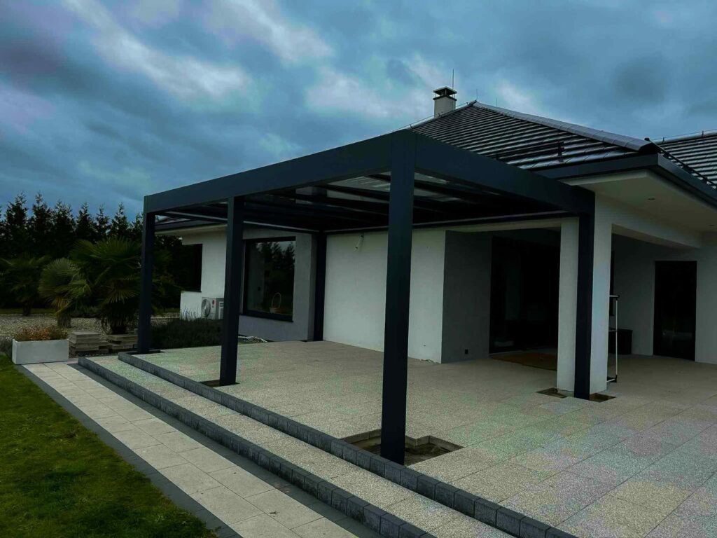 Wir haben abgeschlossen Erste Phase der Montage einer luxuriösen Terrassenüberdachung, das sich durch Eleganz und eine schlichte, moderne Form auszeichnet. Diese Lösung wurde mit Blick auf Komfort, Ästhetik und höchste Verarbeitungsqualität entwickelt.