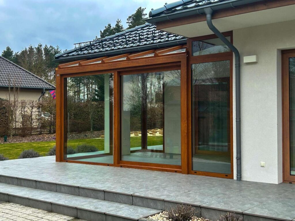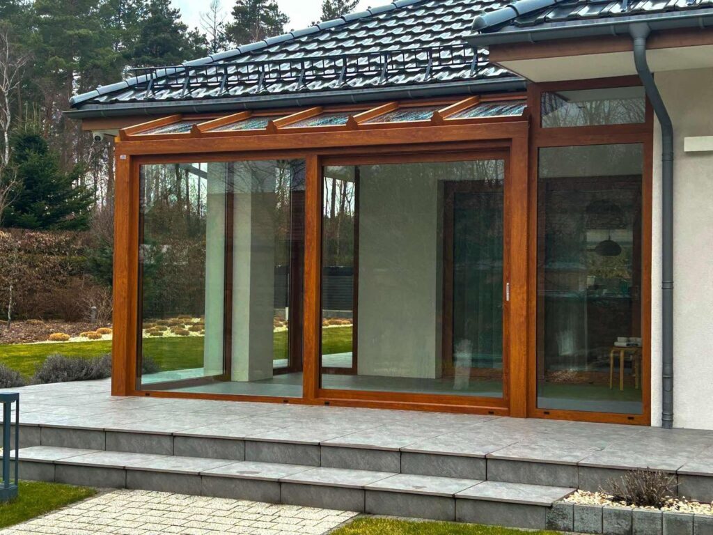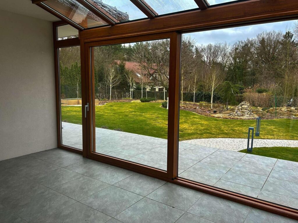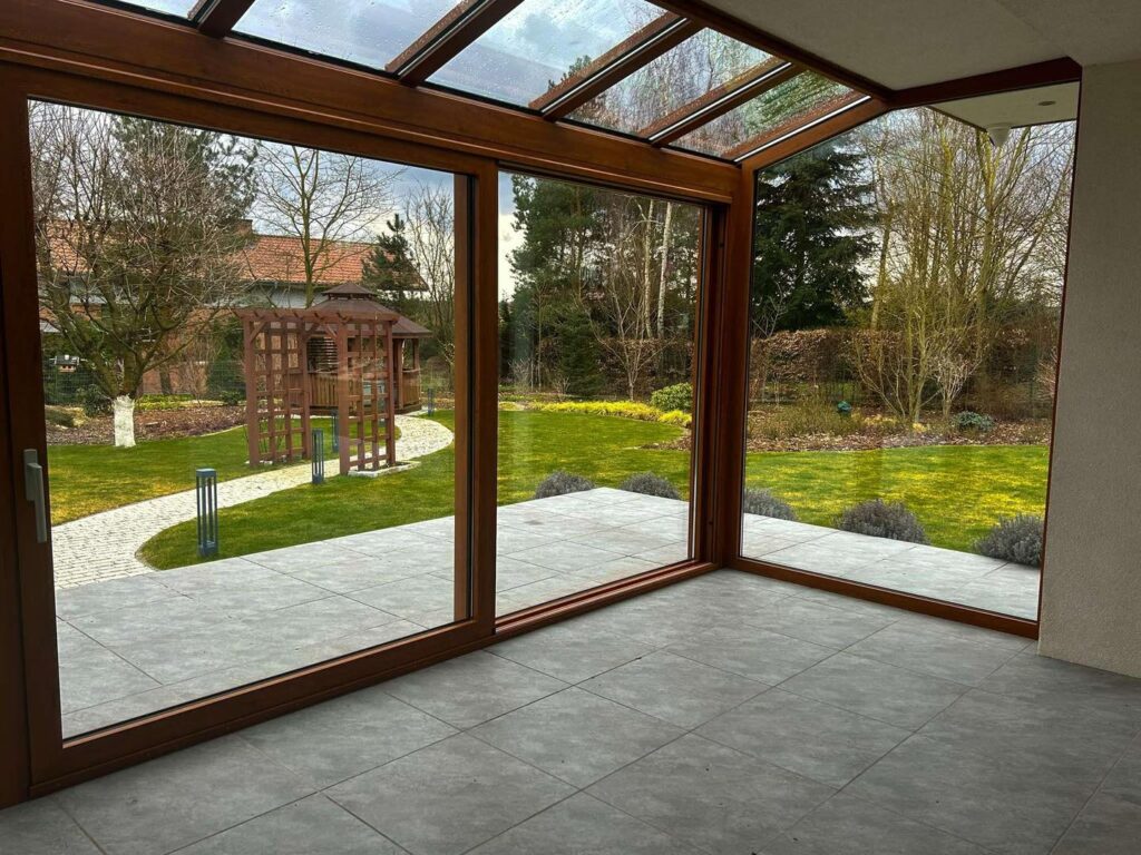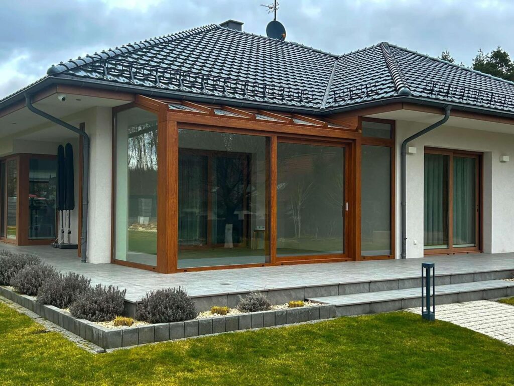 Na życzenie prywatnego inwestora wykonaliśmy w Szczecinie ogród zimowy. Zastosowany został system ciepły, piękny, drewnopodobny kolor oraz duże drzwi typu HS.