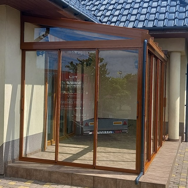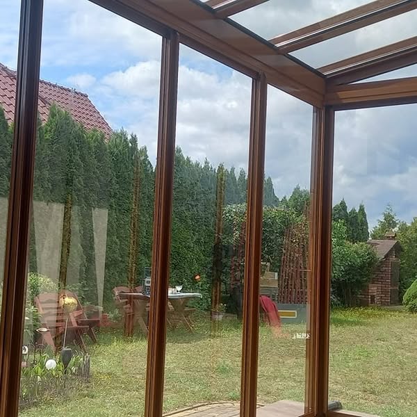 Właściciele wybrali indywidualny kolor konstrukcji, idealnie dopasowany do elewacji i otoczenia ogrodu. Efekt? Nowoczesna, lekka forma, która jednocześnie emanuje przytulnością.